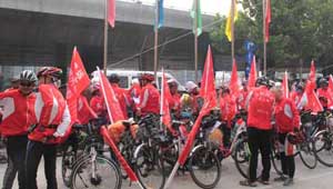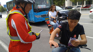 骑行队向路人发放资料
